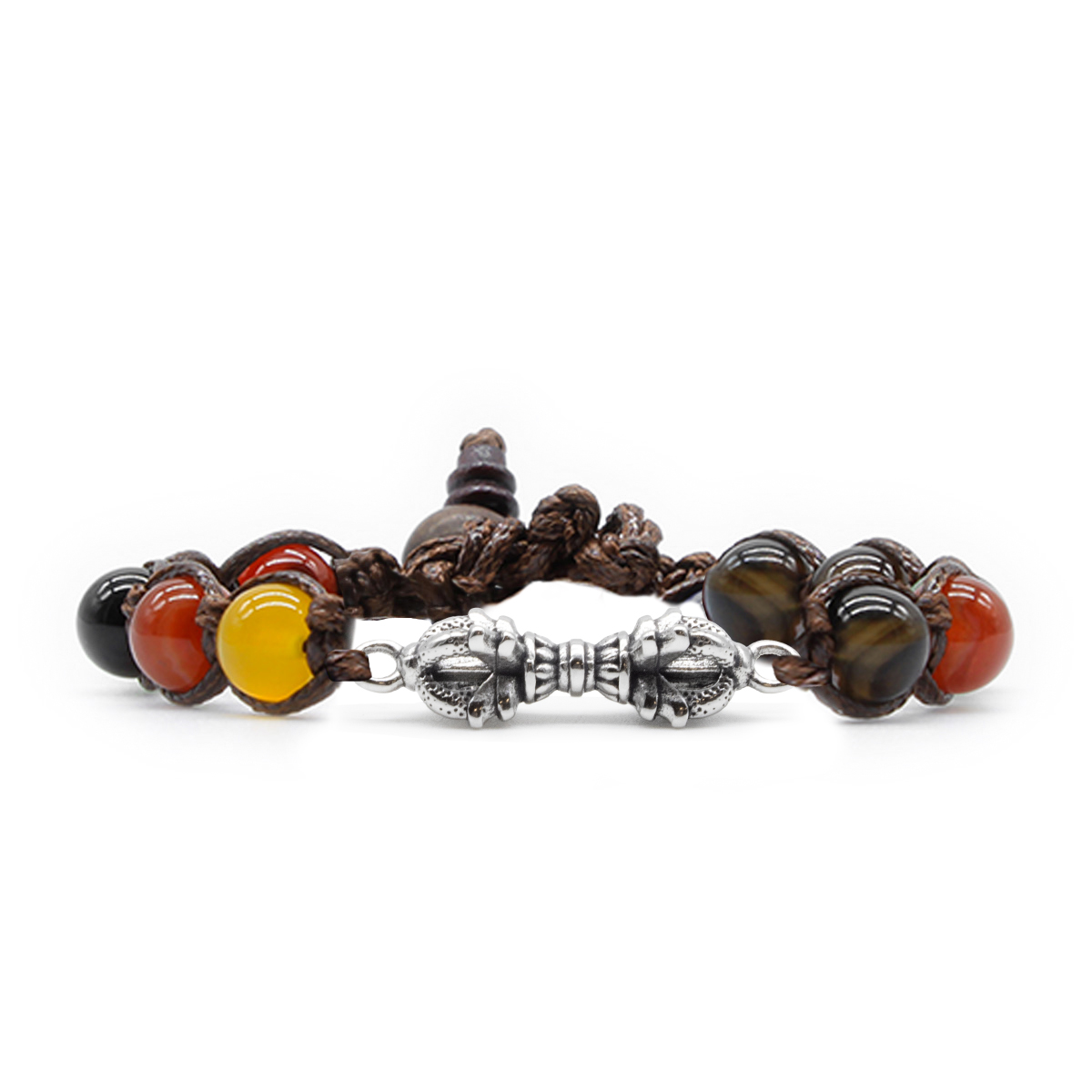 Bracciale Kenshò con “Dorje o Vajra”, pietre Agata multicolore da 8 mm e cordoncino marrone. Taglia unica, si adatta ad ogni tipo di polso.