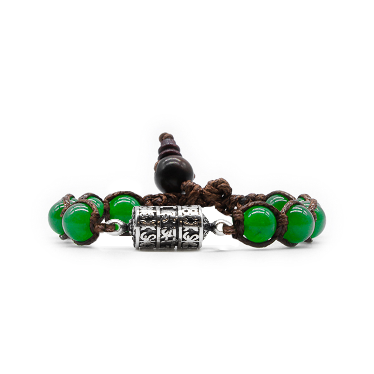 Bracciale Kenshò con la “Ruota della preghiera” con pietre Agata Verde da 8 mm e cordoncino marrone. Taglia unica, si adatta ad ogni tipo di polso.