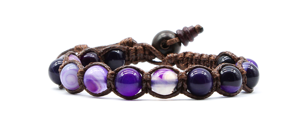 Bracciale Kenshò unisex realizzato con pietra Agata Viola Striata e cordoncino marrone. Pietra naturale 8 mm. Taglia unica, si adatta ad ogni tipo di polso.