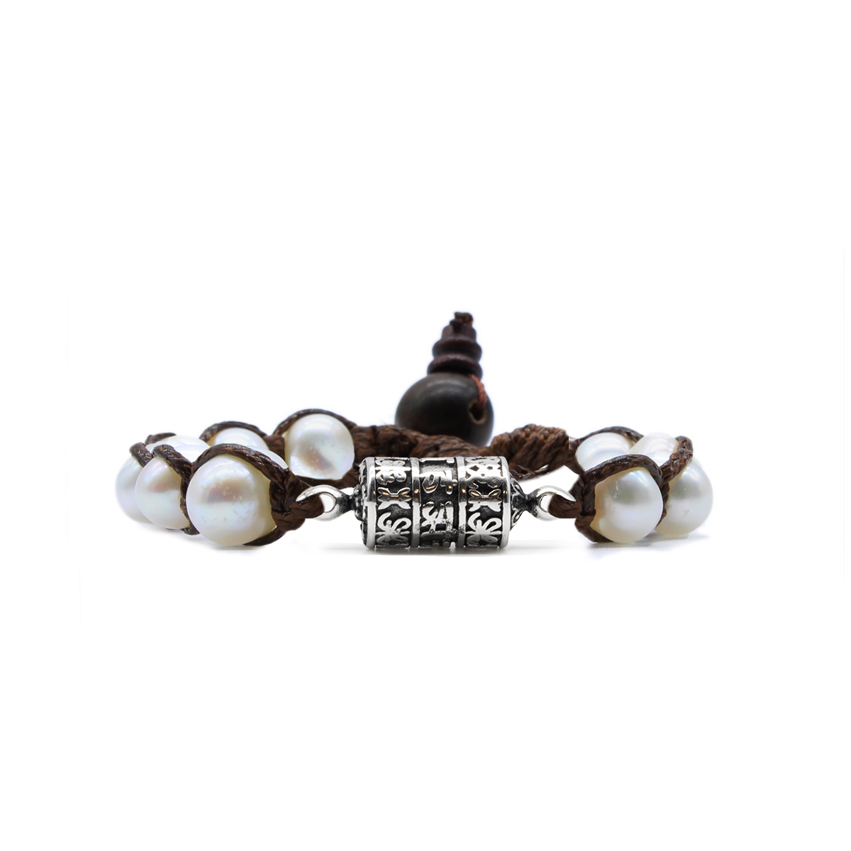 Bracciale Kenshò con la “Ruota della preghiera”, Perle Naturali da 8 mm e cordoncino marrone. Taglia unica, si adatta ad ogni tipo di polso.