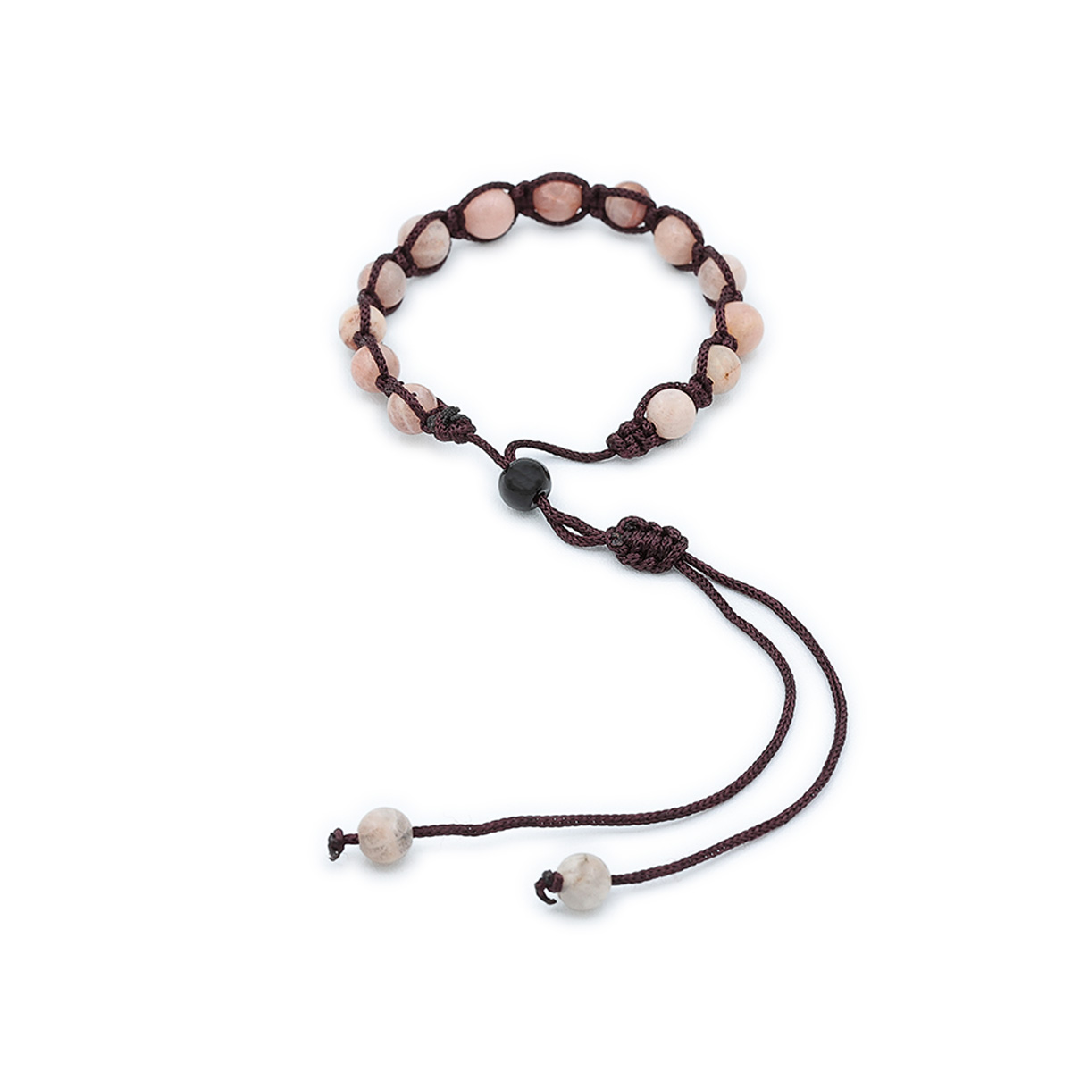 Bracciale Kenshò unisex realizzato con Pietra di Luna e cordoncino marrone con chiusura a nodo macramé. Pietra naturale 6 mm. Taglia unica.
